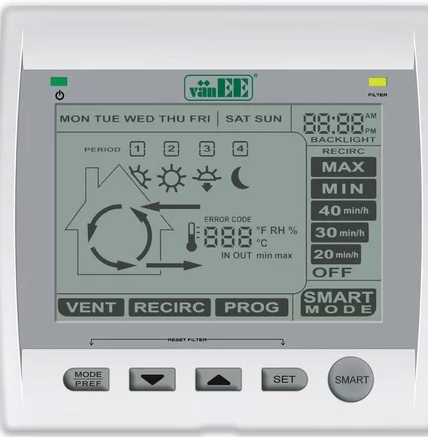 This state-of-the-art control offers an impressive choice of operating modes, yet remains simple to use. Platinum now provides even more control over ventilation and indoor air quality while the fully automatic “SMART” mode feature gives today’s homeowners the energy efficiency they demand with the comfort they desire. The Platinum wall control’s attractive, customizable LCD display will please customers and reduce callbacks.